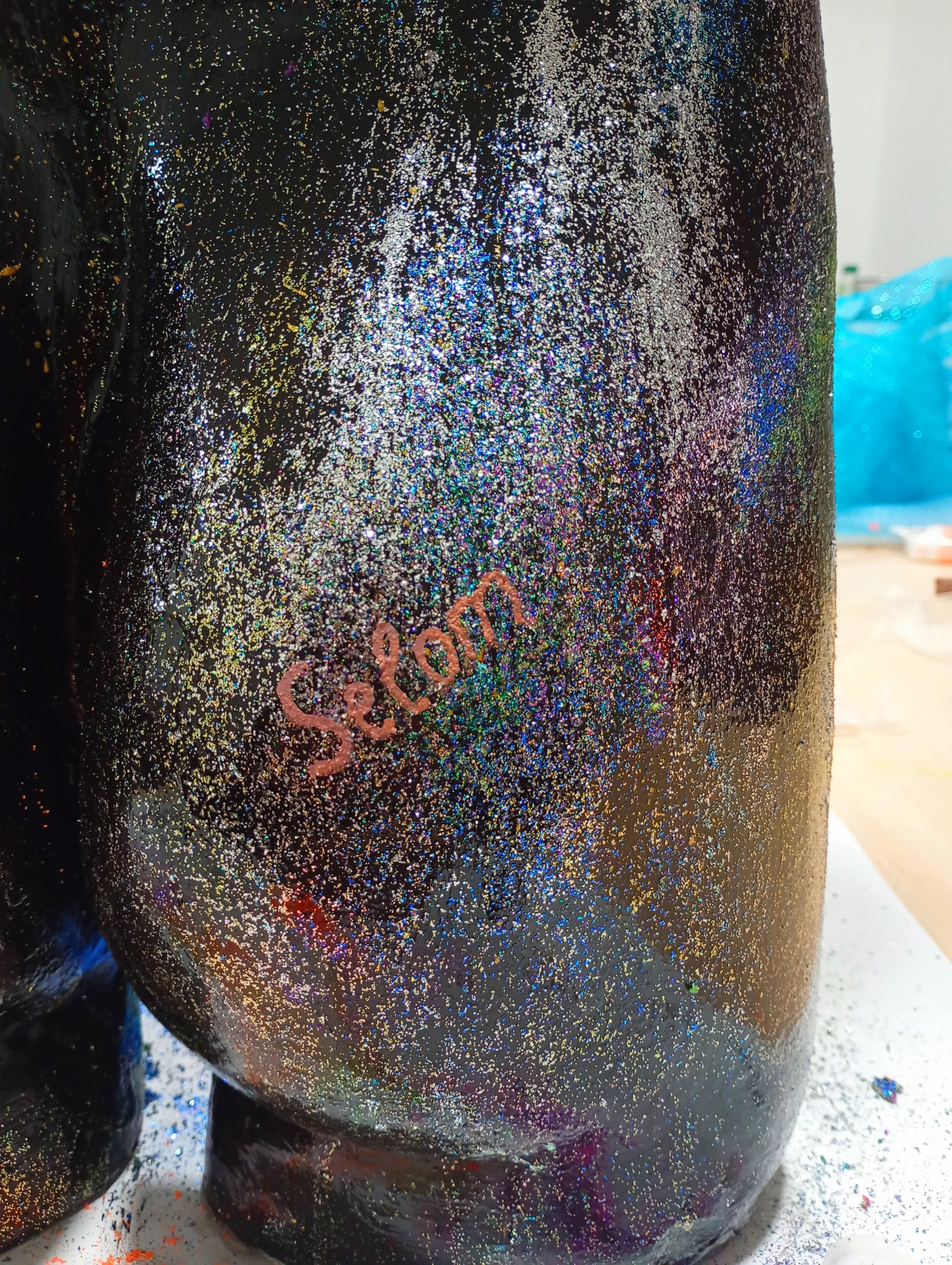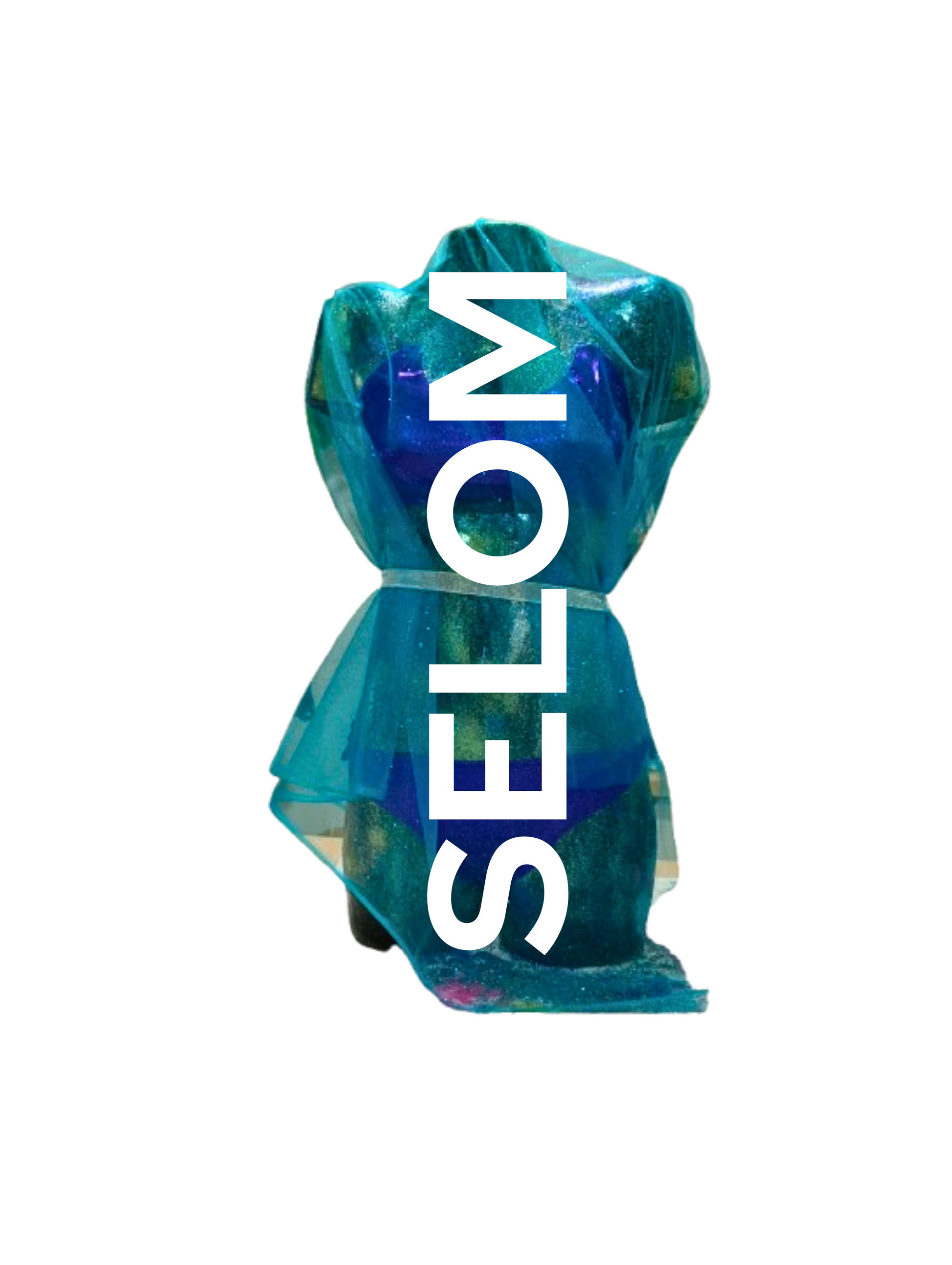 La creatividad de está pieza de arte es de un maniquí de yeso hecho con el molde del cuerpo de la artista SELOM, con este lienzo tridimensional se ha hecho una base oscura y se ha pintado con diferentes colores de purpurina.
